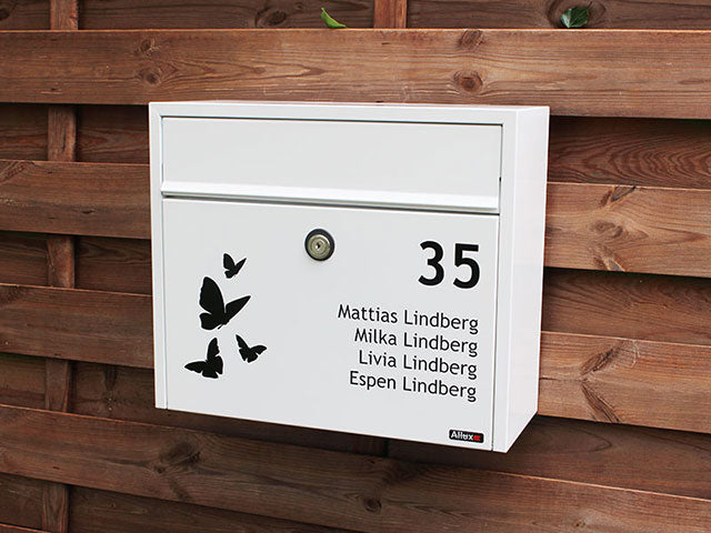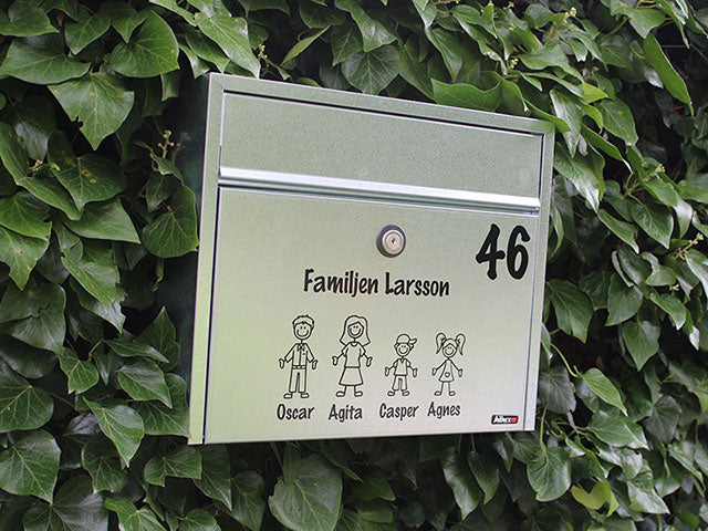 Postkassesticker – valgfri skrifttype: husnummer i højre hjørne, fornavne & to efternavne